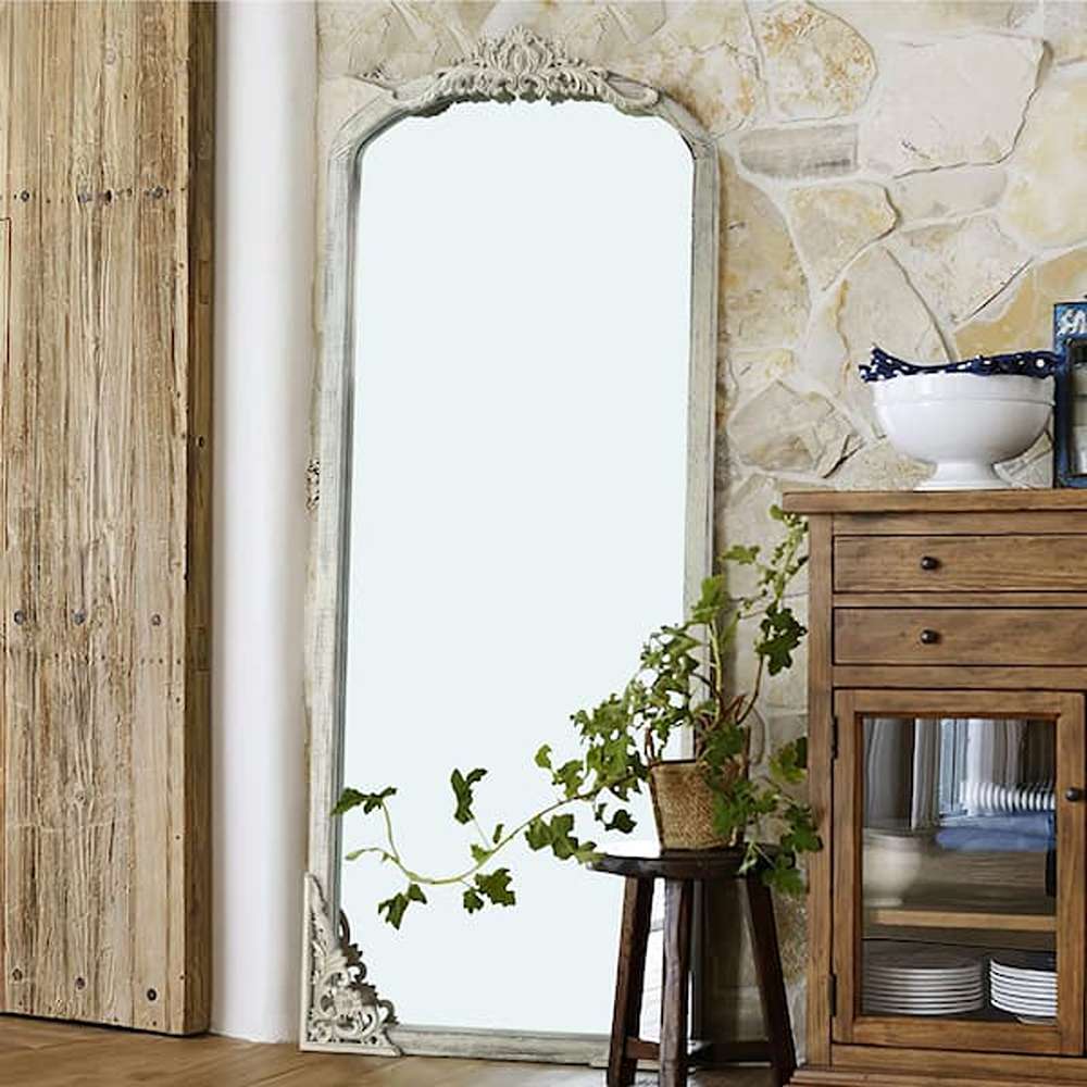 This full-length floor mirror is versatile in its placement options. It can be leaned against a wall for a casual, relaxed look or mounted for a more permanent setup. Its substantial size and elegant design make it suitable for various interior themes, from cozy farmhouse to modern minimalism. Whether used as a statement piece in a bedroom or as a functional accent in a dressing area, this mirror combines practicality with timeless style.